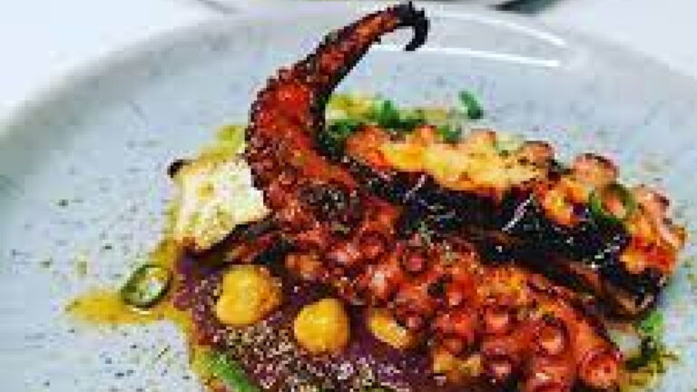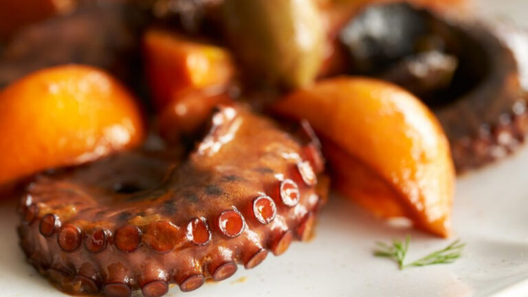Ingredients 1 large octopus Moyseafood (about 1.5 kg) 200ml white wine Juice of 2 oranges 1 onion, finely chopped 2 garlic cloves, crushed Extra virgin olive oil Theo Fresh thyme…