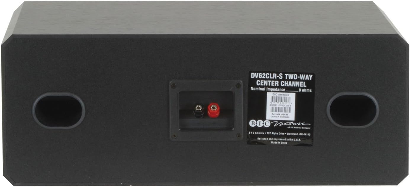 Product Description The BIC America DV62CLR-S 175 Watt 2-Way 3-Driver 6.5 In. Center Channel Speaker uses state-of-the-art components to produce lifelike sound and imaging rich in clarity. Its custom-designed .75 in. poly dome tweeter and dual 6.5 in. poly graphite woofers reproduce everything from whisper soft vocals in a jazz song to the loudest explosions in an action movie. Patented dual "Venturi" vents enable the DV62CLR-S to produce extended bass output down to 38 Hz! Amazon.com To fully enjoy a surround sound soundtrack, listeners need a topnotch center channel speaker, and this BIC America two-way model more than qualifies. Described as "Hands down the best-sounding center speaker I've ever heard" by a reviewer at Home Theater Magazine, the DV-62CLRS boasts a combination of state-of-the-art component circuitry, three high-quality drivers, dual vents, and a unique crossover design to produce extremely lifelike sound and imaging. The speaker is built around two 6-inch polypropylene/graphite woofers and a 0.75-inch poly dome tweeter, which team to produce an extremely wide (for a center speaker) 38 Hz to 20 kHz frequency response. As a result, dialogue sounds rich and fluid, giving your DVD soundtracks added depth. Additional specs include a sensitivity rating of 90 dB, a 3.5 kHz crossover, and 8-ohm impedance. The DV-62CLRS is compatible with a variety of amps, with a recommended power rating of 10 to 175 watts per channel. Listeners will also appreciate the speaker's attractive design, which features a relatively slim profile and a black laminate finish. For surround applications, the speakers perform particularly well when matched with other BIC America models, which are tonally matched to deliver a balanced audio profile. The company recommends using its DV84 tower speakers for the front channels, a pair of DV62si bookshelf speakers for the rear channels, and the V1215 subwoofer for top-level bass performance. All the speakers in the DV line are magnetically shielded to prevent video interference when located near a TV or monitor. The speaker measures 20 by 7.65 by 10 inches (W x H x D) and carries a generous seven-year limited warranty on parts and labor. What's in the Box DV-62CLRS center speaker, warranty card, user's manual.