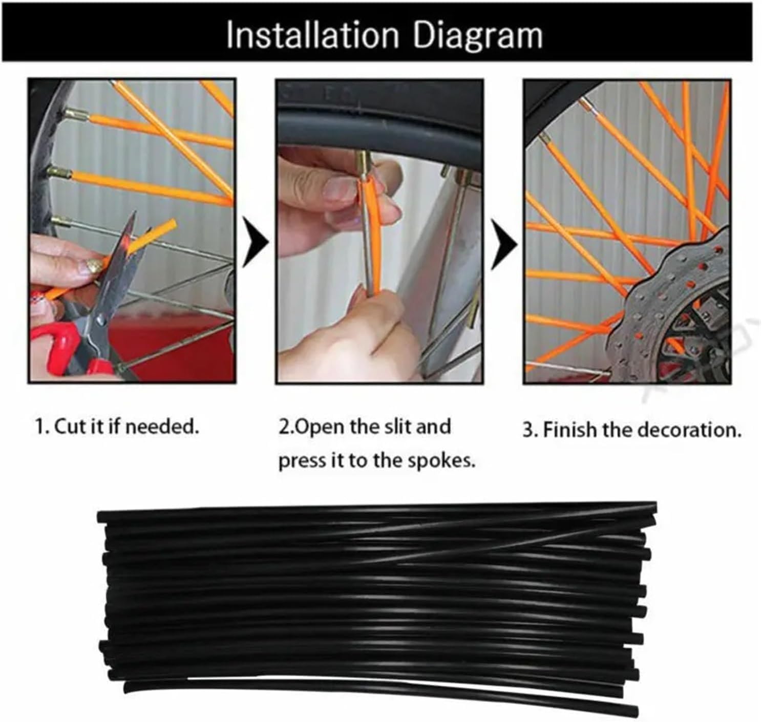 Spoke Skins Covers, 72PCS Rim Decoration Wheel Spoke Wraps Straws Motorcycle Decoration Protector PipeSpecification :1.100% Brand New, Never Mounted, High Quality2. Durable, long lasting covers Compatible with your dirt bike's front and rear spokes3. It not only make your bike look great, but keep your spokes from vibrating loose and protect them4. You will have to trim them a little during installation5. Easy To Install6. Can be trimmed to Compatible with smaller wheels.7.Length: 240 mm, Outer Diameter: 6mm, Inner Diameter: 4.9mm. 8. Qty: 72 pcs Package included :1x Pack Wheel Spoke Wraps (72pcs)Protective parts : OtherHign-concerned Chemical : NoneItem Weight : 200gItem Height : 2cmItem Width : 19cmItem Length : 26cmModel Name : Spoke Skins Covers 72PCSOrigin : Mainland ChinaItem Type : Covers & Ornamental MouldingsCondition : 100% Brand New High QualityColor : Orange/Black/Blue/RedItem Style : Motorcycle AccessoriesModel name : Motorcycle Wheel Rim Spoke Skins Coversitem name : Motorcycle Wheel SpokeQuantity : 72 pcs ( Compatible with 2 tires )Item Type : Covers and ornamental moldings