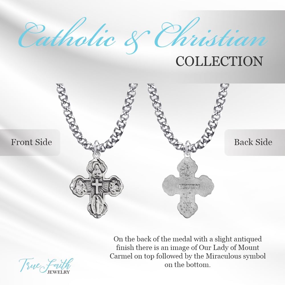 TrueFaithJewelry Sterling Silver Engraved Four Way Medal NecklaceThe 4 Way Medal Cross combines four medals that are significant to the Catholic Faith. The pendant is shaped like a cross and has the raised symbols of the Sacred Heart, St. Joseph, St. Christopher, and the Miraculous Medal on the front. The back of the medal features the inscription “ I Am a Catholic Please Call a Priest”. A wonderful religious cross pendant for men and women to bring your faith to life. The Catholic necklace comes in a deluxe velour jewelry box ready to be the perfect gift. Great for everyday wear.Product FeaturesMedal - Sterling Silver - 5/8 Inch (L)Chain - 18-inch Stainless Steel with Rhodium Finish - Lobster Claw ClaspComes in a Jewelry Gift Box